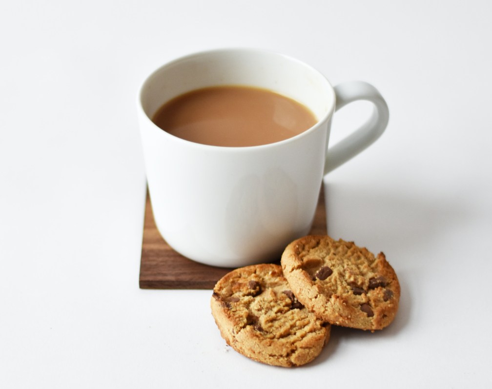 Cup of milky tea with two chocolate chip biscuits